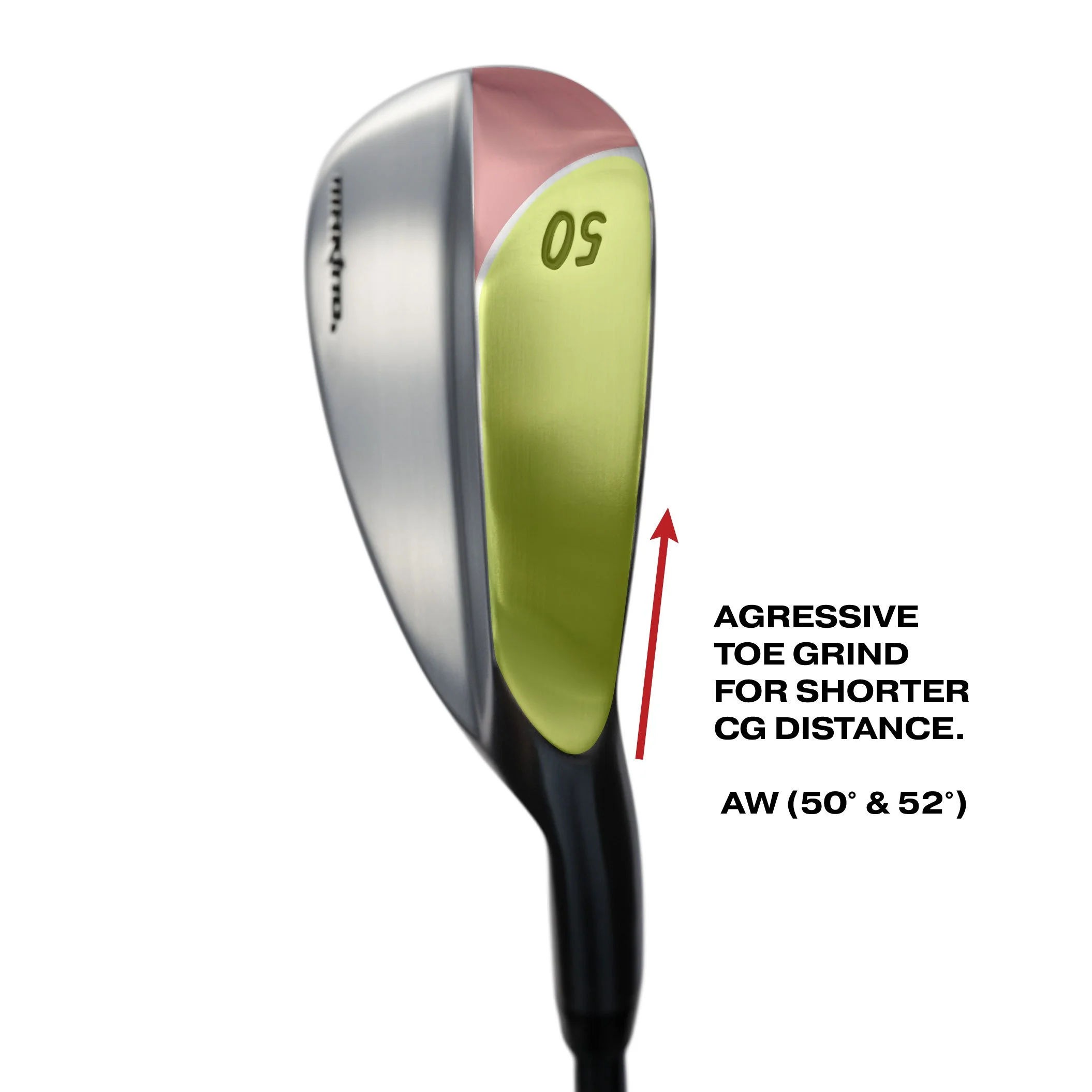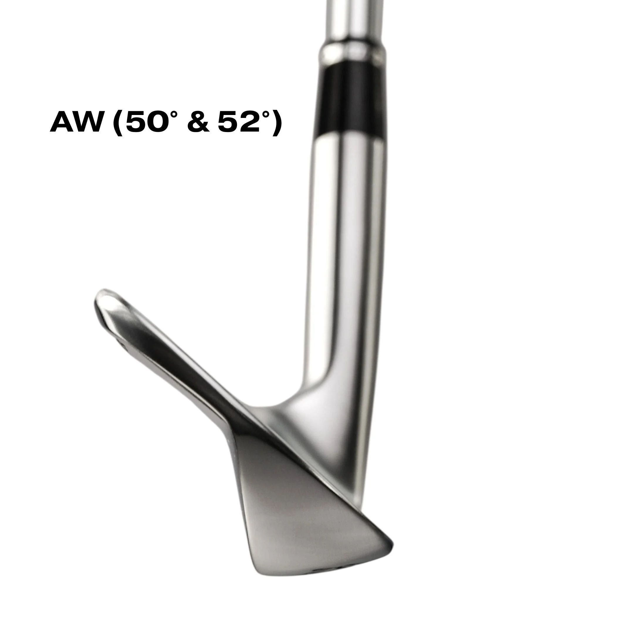 The AW (50–52°) has its center of gravity shifted toward the heel, and the heel portion of the sole is deliberately preserved. This creates a highly manual feel, allowing shots over 80 yards to have the feedback of a muscle-back iron. The face contour is designed to emphasize the iron-like appearance when addressing the ball, with the heel dropped significantly and the toe apex extended high and far, giving a strong triangular impression.